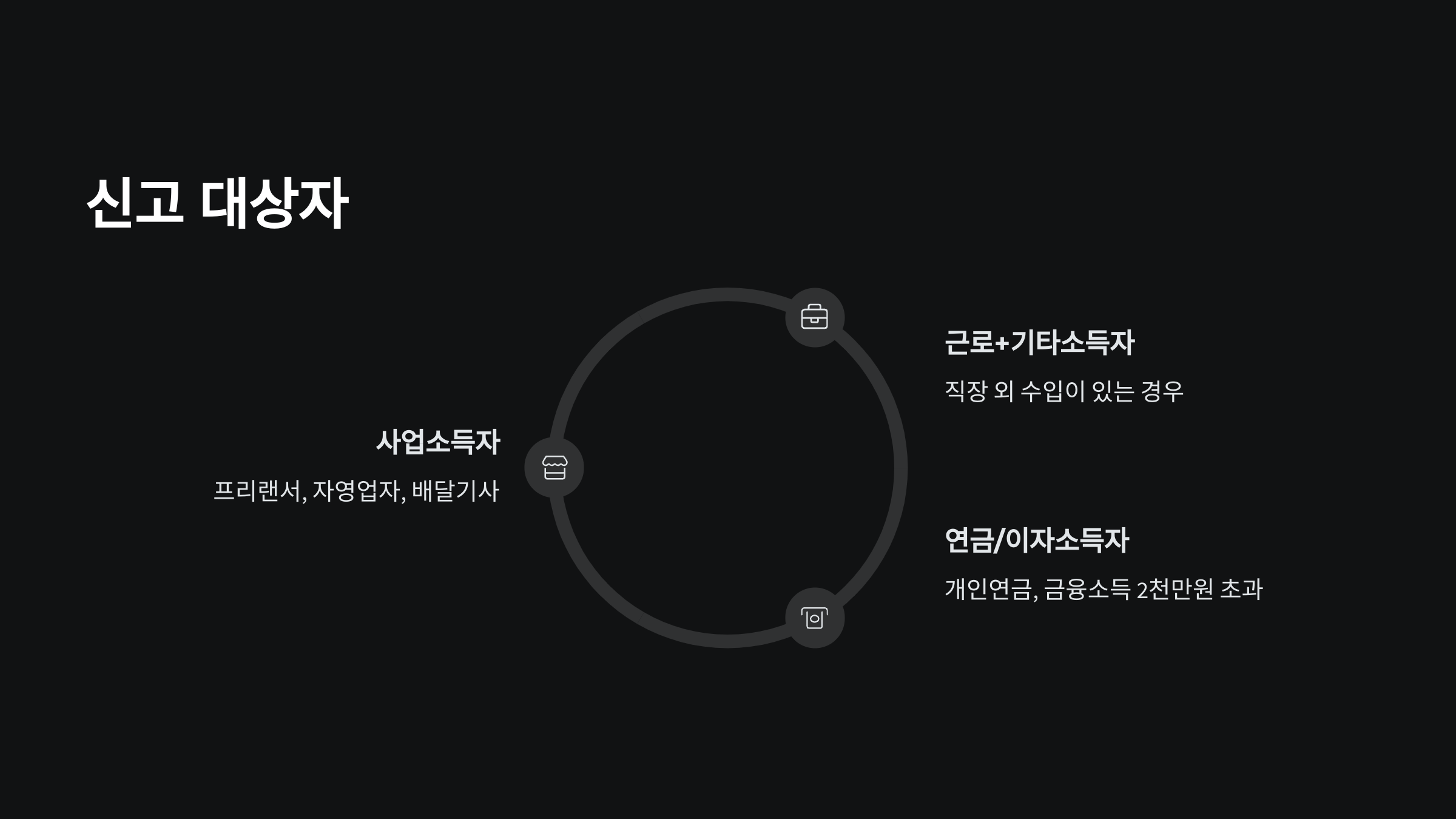 | 연금/이자소득자 | 국민연금 외 개인연금, 금융소득 2천만원 초과 시 |