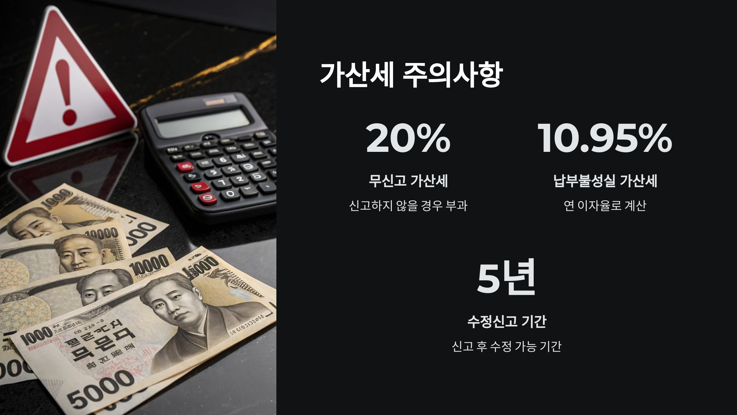 무신고 가산세(20%)와 납부불성실 가산세(연 10.95%)가 부과될 수 있어요. 의도적 누락 시 세무조사도 나올 수 있습니다.