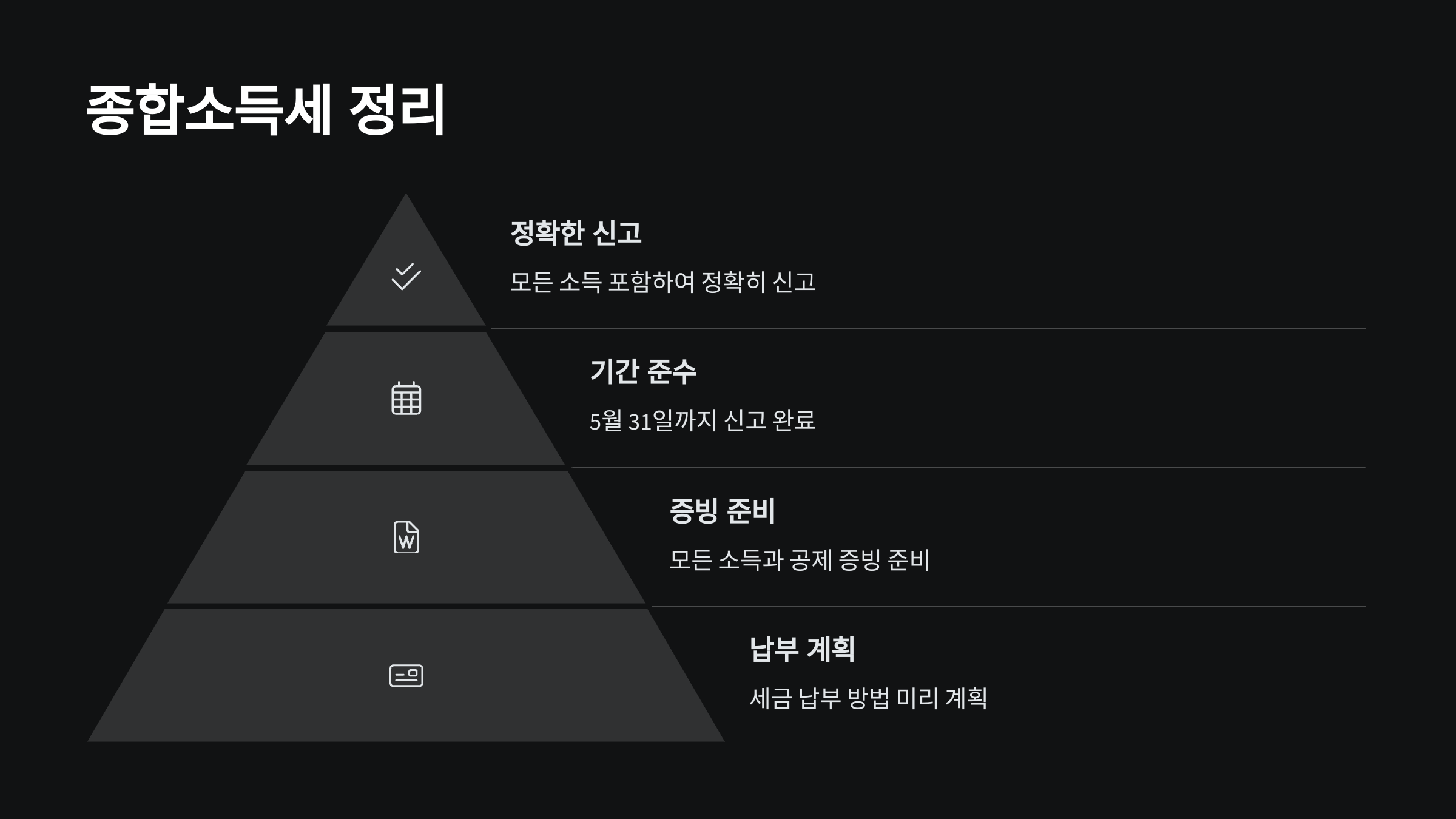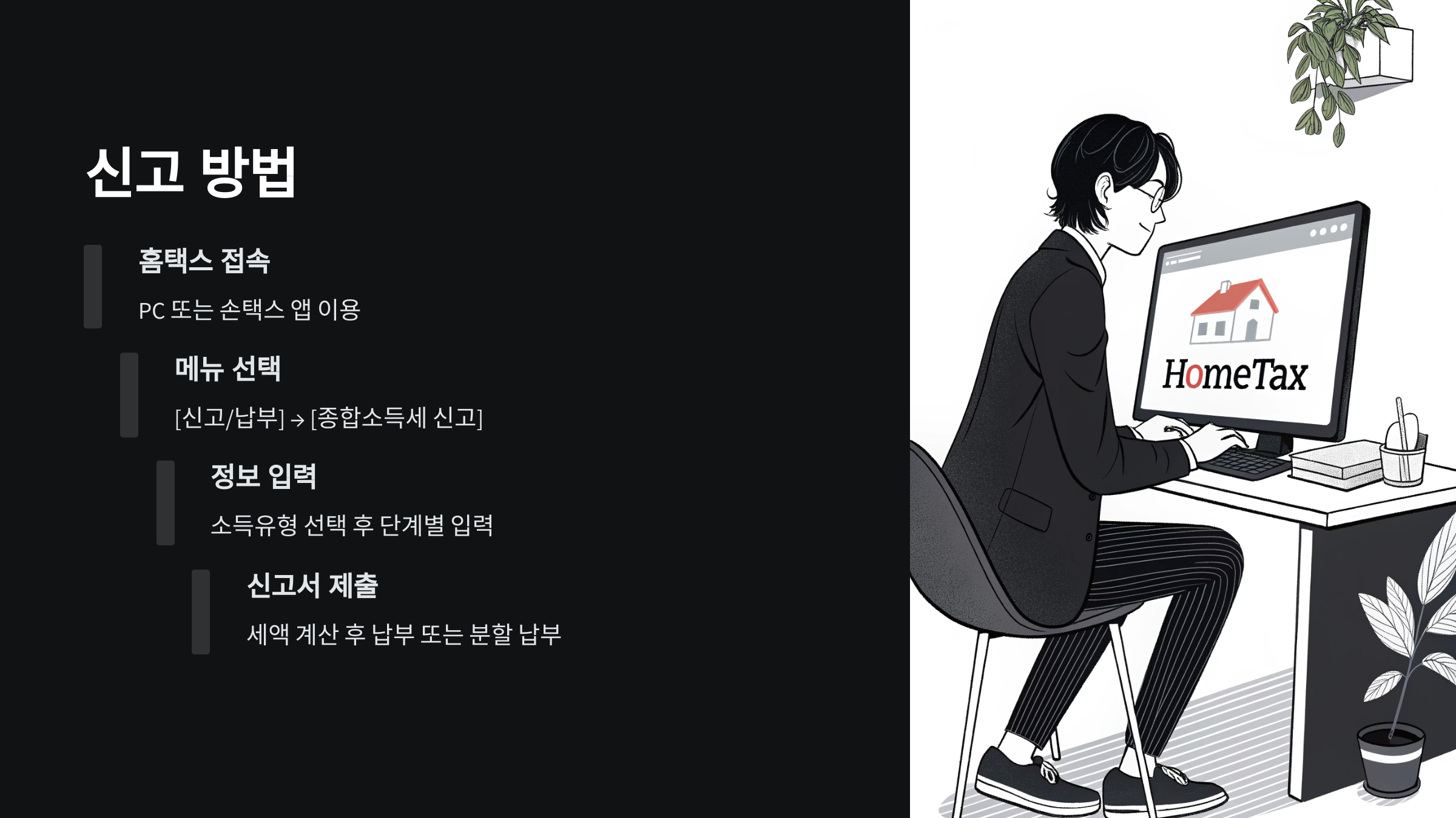 매년 5월이 신고 기간입니다. 전년도 소득을 기준으로 하며, 기한을 넘기면 가산세가 발생할 수 있으니 반드시 기억해두세요.